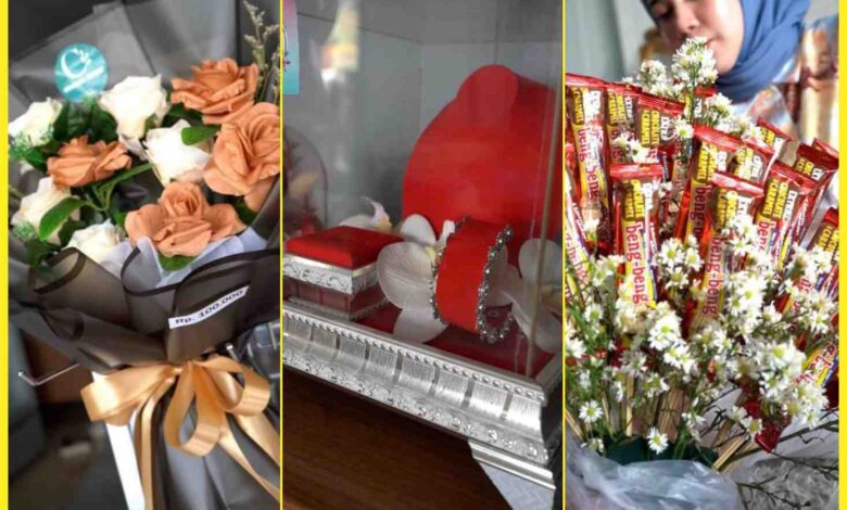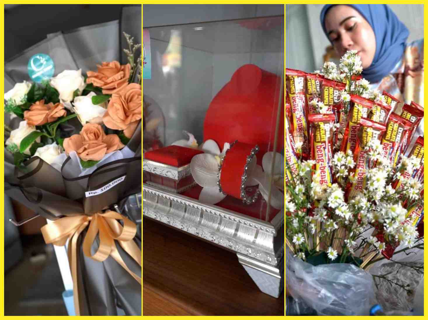 Selain menjual berbagai buket, Gallery Fika yang berdiri mulai 2016 ini juga menerima pesanan jasa menghias kotak antaran pengantin.